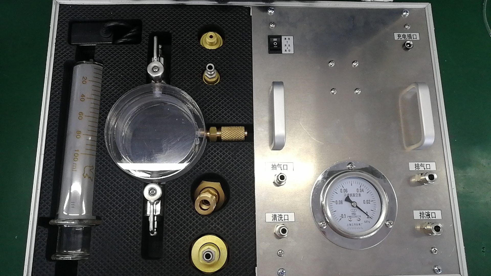 (2)本實用新型的一種變壓器氣體采集裝置,其抽真空時先將抽氣轉接頭與第二閥門連通,然后關閉第一閥門打開第二閥門,控制真空泵工作,真空泵工作從抽氣盒內抽氣,抽出的氣體先通過油氣分離器進行處理,利用油氣分離器能使得真空泵不會被油污染而損壞,經油氣分離器處理后的氣體經真空泵后自排氣轉接頭排出,通過觀察操作板上的負壓表來決定何時停止抽真空,當抽真空完畢后關閉第二閥門,此時抽氣盒內環(huán)境處于真空狀態(tài);