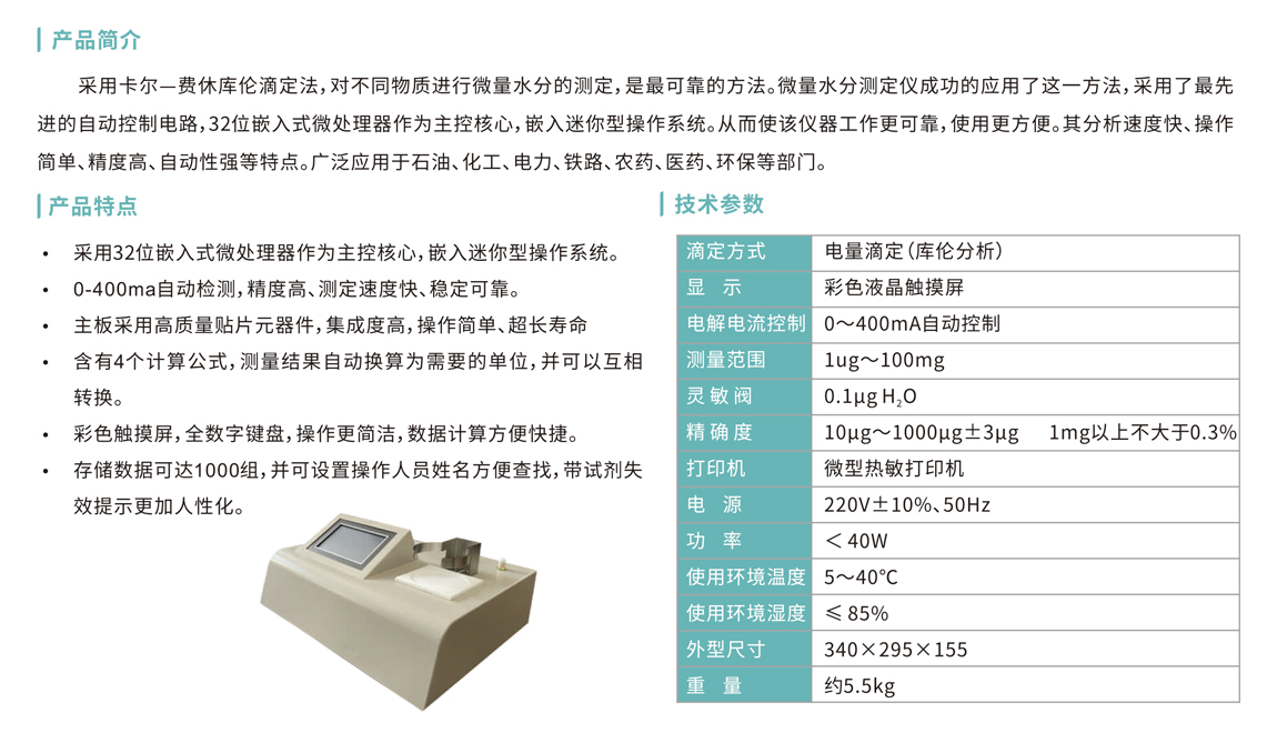 采用卡爾一費(fèi)休庫(kù)倫滴定法,對(duì)不同物質(zhì)進(jìn)行微量水分的測(cè)定,是最可靠的方法。微量水分測(cè)定儀成功的應(yīng)用了這一方法,采用了最先