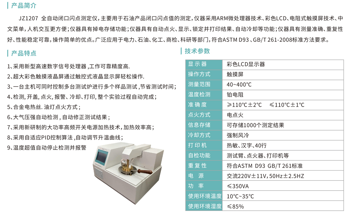 JZ1207全自動(dòng)閉口閃點(diǎn)測定儀,主要用于石油產(chǎn)品閉口閃點(diǎn)值的測定,儀器采用ARM微處理器技術(shù)、彩色LCD、電阻式觸摸屏技術(shù)、中