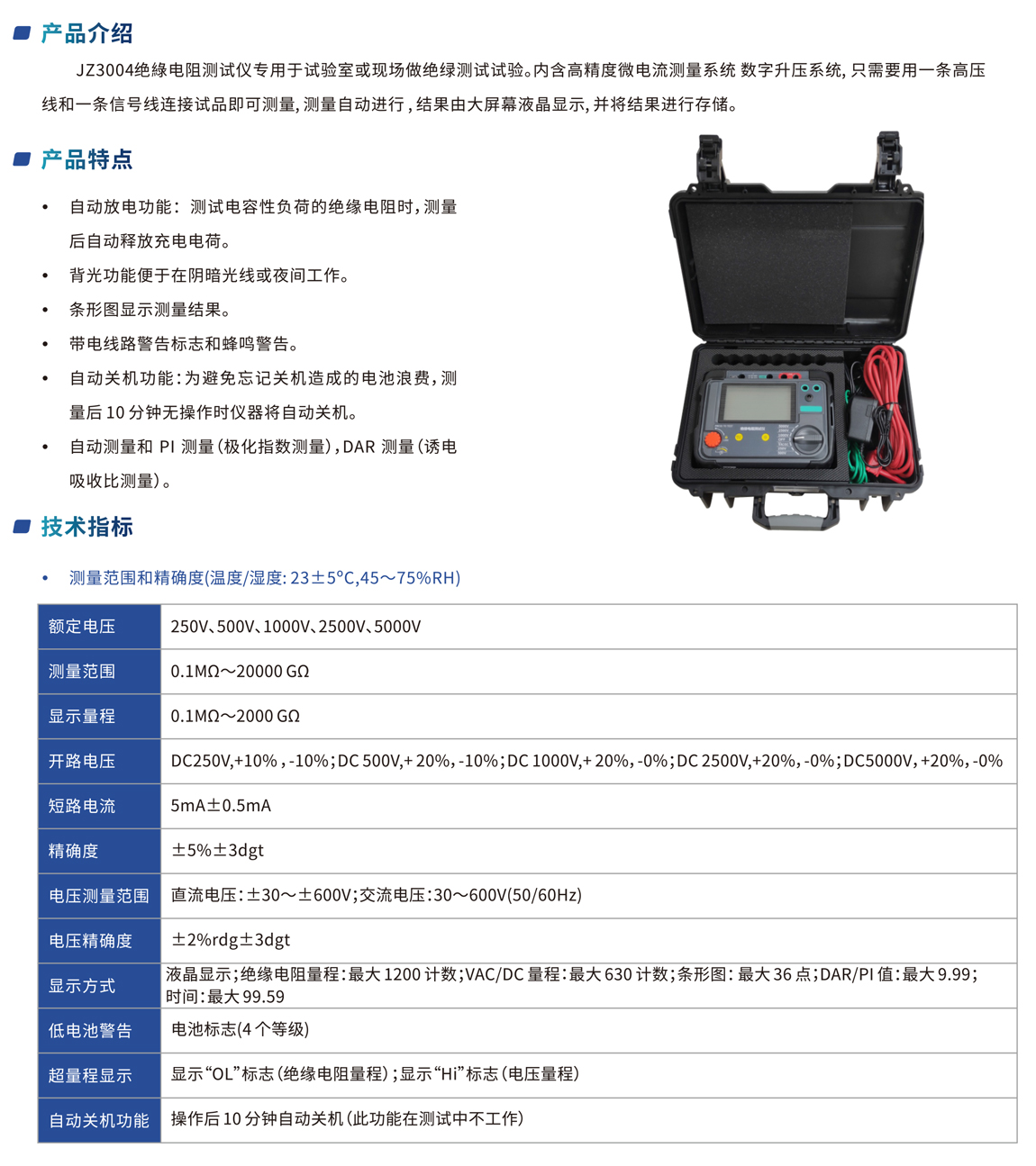 JZ3004絕綠電阻測試儀專用于試驗室或現(xiàn)場做絕綠測試試驗。內(nèi)含高精度微電流測量系統(tǒng)數(shù)字升壓系統(tǒng),只需要用一條高壓 線和一條信號線連接試品即可測量,測量自動進行,結果由大屏幕液晶顯示,并將結果進行存儲。