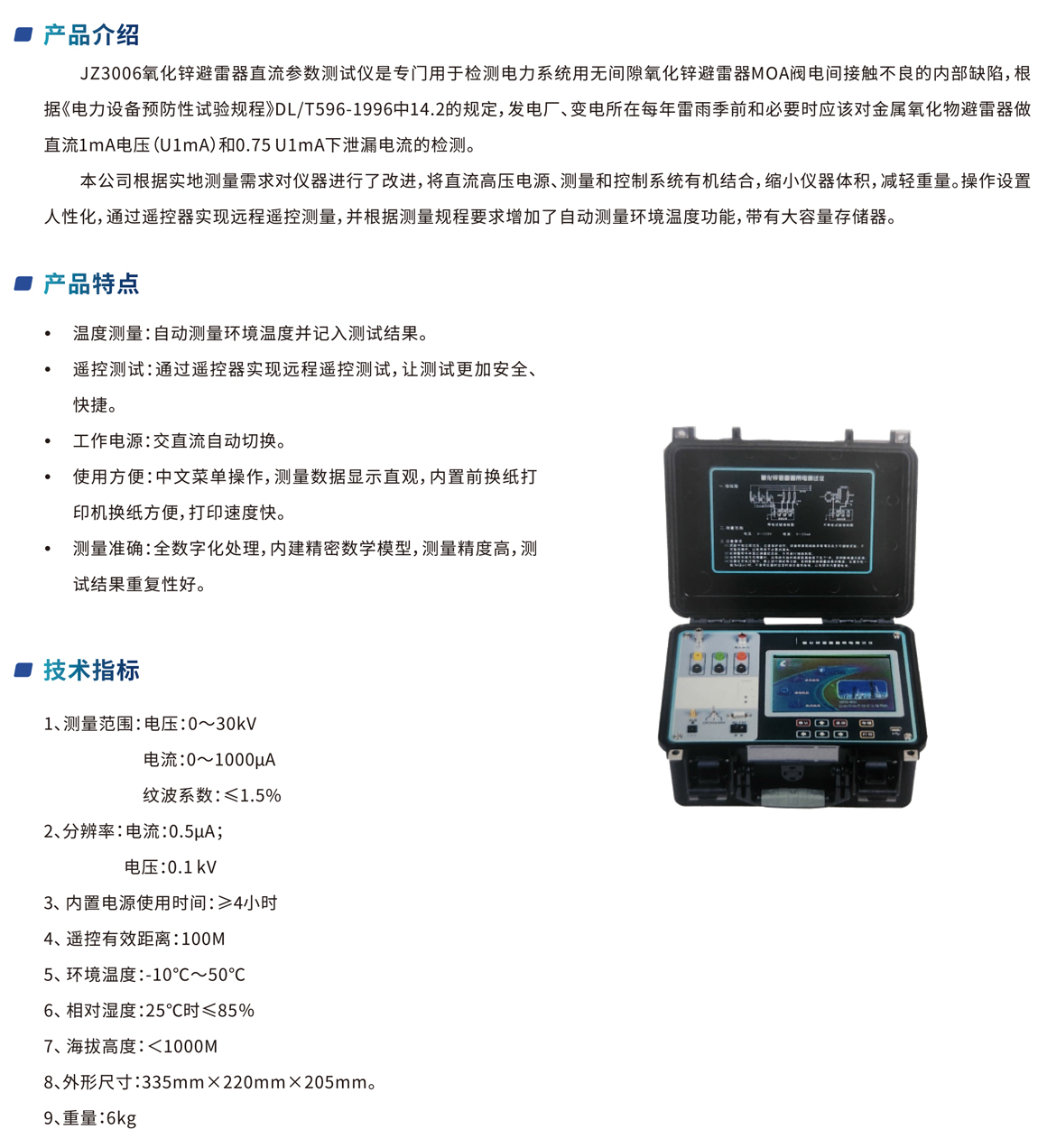 JZ3006氧化鋅避雷器直流參數(shù)測(cè)試儀是專門用于檢測(cè)電力系統(tǒng)用無(wú)間隙氧化鋅避雷器MOA閥電間接觸不良的內(nèi)部缺陷,根