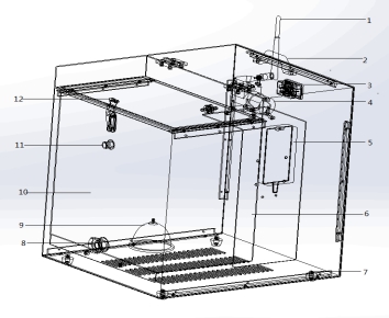 凈化系統(tǒng)組成部件:1、改進后433M無線通訊模塊;2、把手、3、電源插口;4、空氣泵;5、電源模塊;6、吸附劑氣室;7、萬向輪;8、排水口;9、氣泡石;10、316不銹鋼內(nèi)膽;11、排氣口;12、注水口