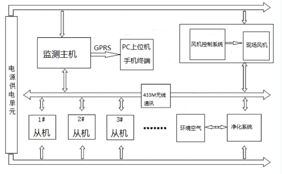 多功能環(huán)境遠程監(jiān)測凈化系統(tǒng)包括一個主機、多個從機采集系統(tǒng)、風機控制系統(tǒng)以及凈化系統(tǒng)這四部分組成。